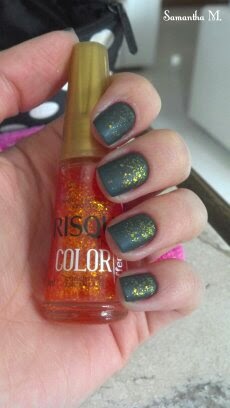 Escolhi como esmalte de fundo para os passarinhos o Renda Paetê da Risqué. Gosto muito desse esmalte. Ele não mancha e seca rápido. O pincel é "ok". Dou nota 7 para ele.
