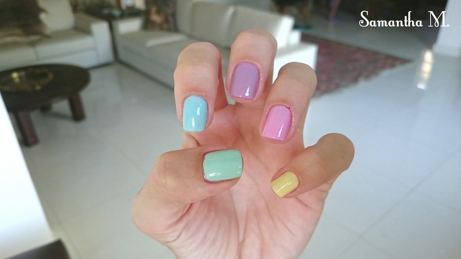 Eu tinha vários esmaltes em várias variações de cores pastéis, mas essas 5 foram as que mais combinaram entre si (na minha opinião, é claro). Eu vou falar rapidinho de cada um dos esmaltes usados.