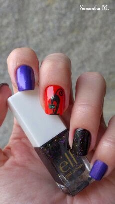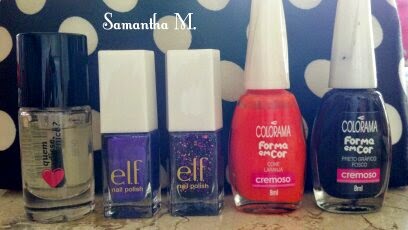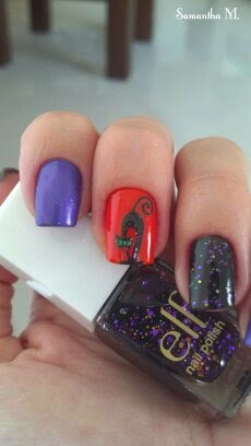 Falando um pouco dos esmalte usados... O roxo é o Purple Dream da e.l.f. Ele possui um shimmer lilás muito, mas muito fininho que faz o esmalte parecer duochrome sem ser. Achei fantástico! O pincel veio meio estranho, porém não atrapalhou a esmaltação me nada. Usei duas camadas. Nota 9.